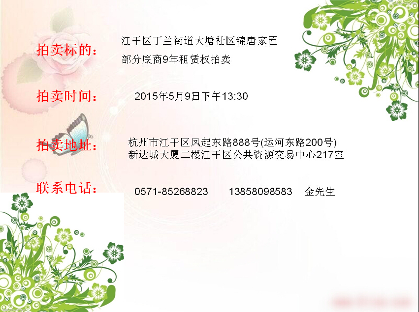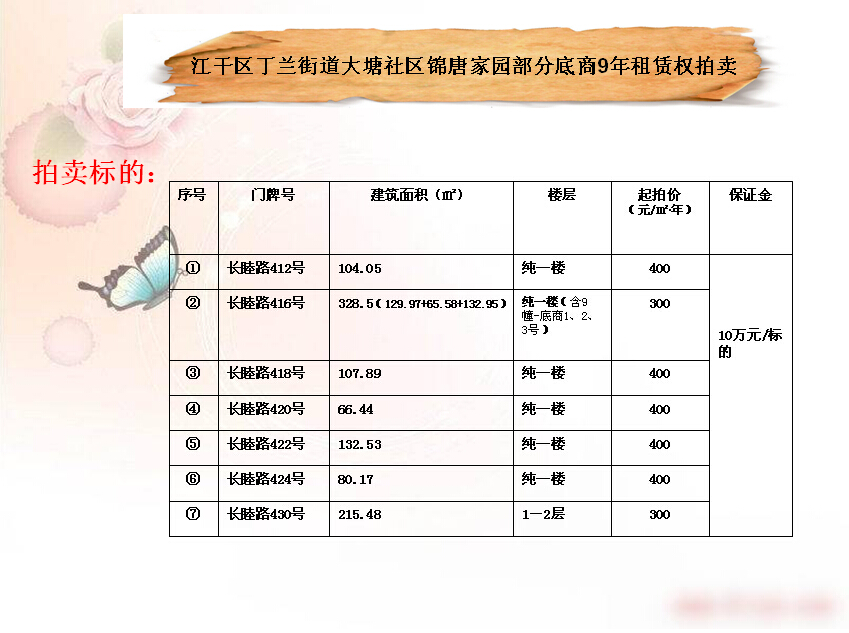 江干區(qū)丁蘭街道大塘社區(qū)錦唐家園部分底商9年租賃權(quán)拍賣