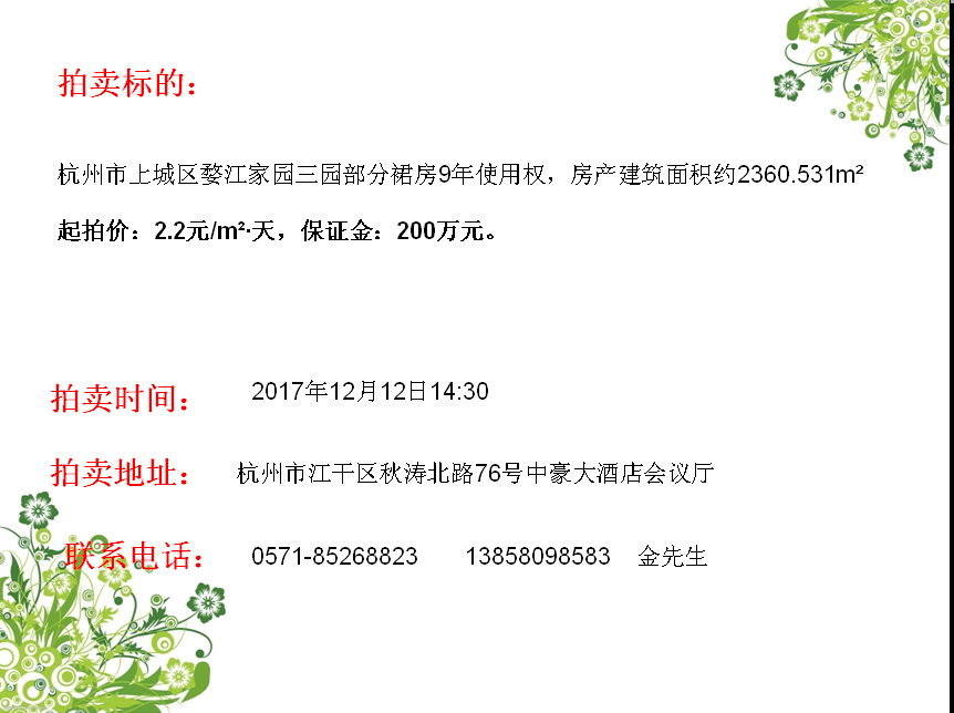 杭州市上城區(qū)婺江家園三園部分裙房9年使用權(quán)拍賣
