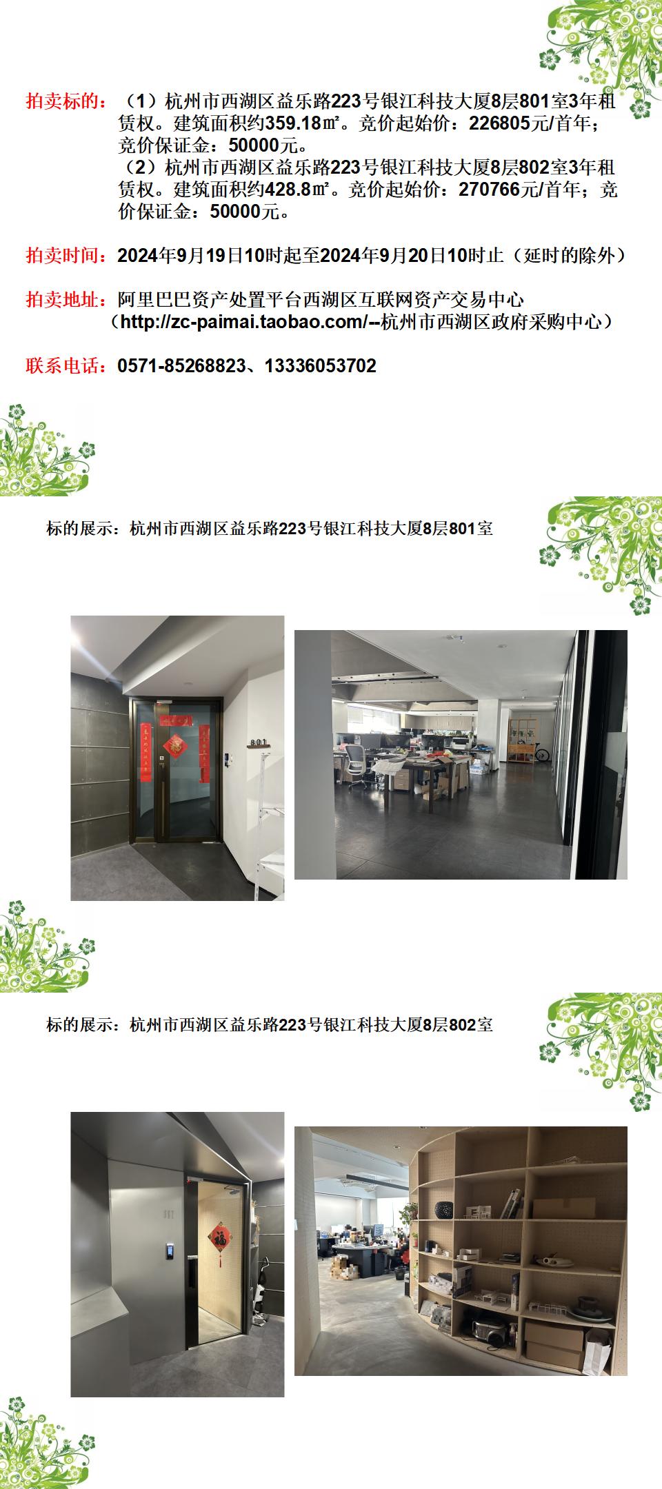 西湖區(qū)益樂路223號銀江科技大廈8層801室等共2處房屋3年租賃權(quán)
